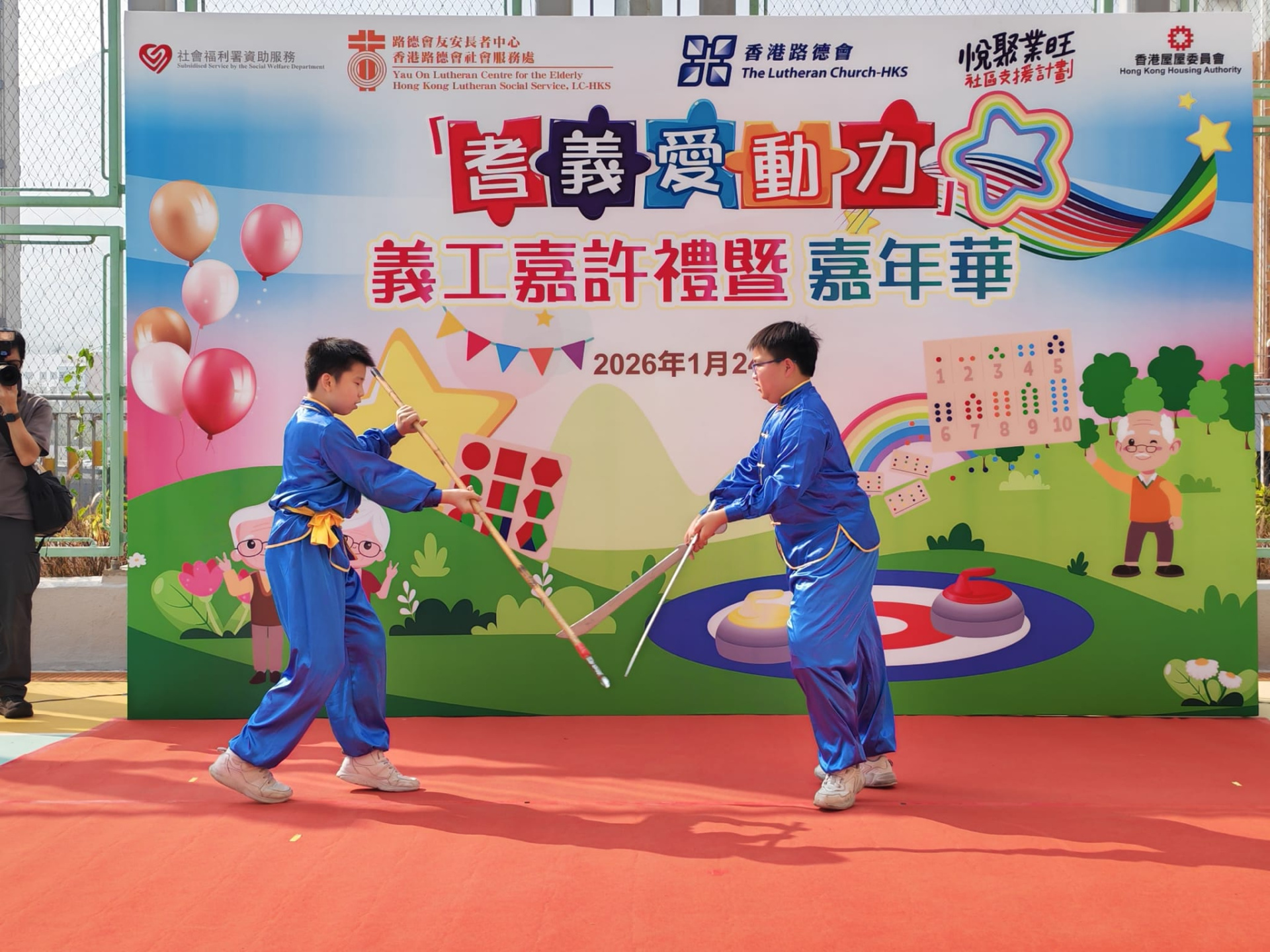 本校獲邀參加由香港路德會社會服務處主辦的「耆義愛動力義工嘉許禮暨嘉年華」。此次活動由校長帶領教師及學生參加,本校武術隊的學生為嘉年華進行表演,同時還特別邀請多位校友回來助陣,為活動增添光彩。